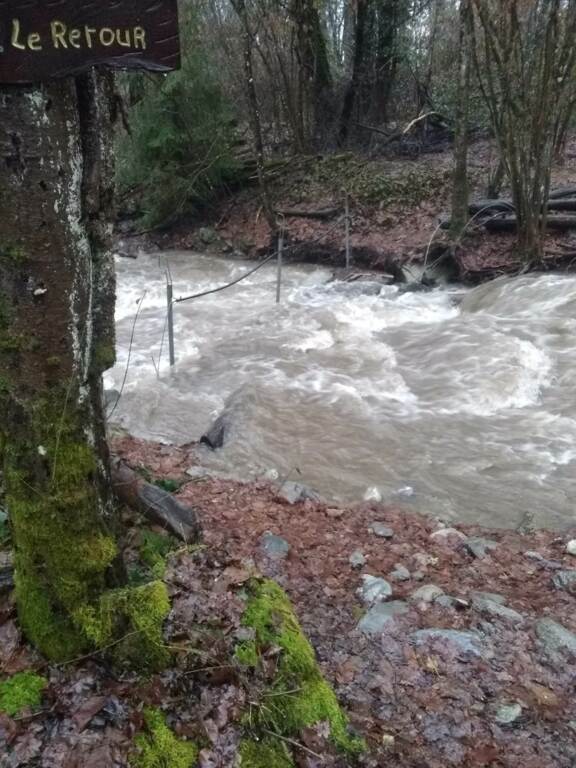 Suite aux fortes chutes de neige, de nombreux arbres se sont couchés sur notre parcours. L'épisode de pluie qui a suivi a entraîné une crue du torrent qui le traverse.